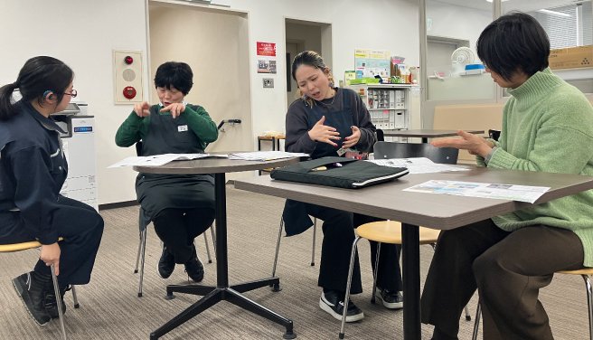 ろう者の第一言語である手話を学び、手話をコミュニケーション手段とする聴覚障がいのある社員と、よりスムーズに意思疎通できるよう楽しく勉強しています。 入門コース「まったく初めての方」と基礎コース「手話の勉強の経験ある方」に分けて毎月2回、手話教室を開催しています。