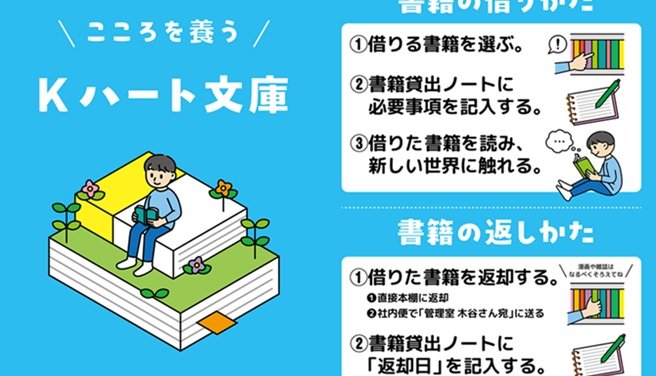 Kハート2階ラウンジの一角にある「Kハートライブラリー」。仕事に役立つスキル本から自己啓発本、セルフケアやお互いの障がい特性を知るための本等々...多ジャンルの本を貸し出ししています。ビブリオバトルなどのイベントも開催しています。