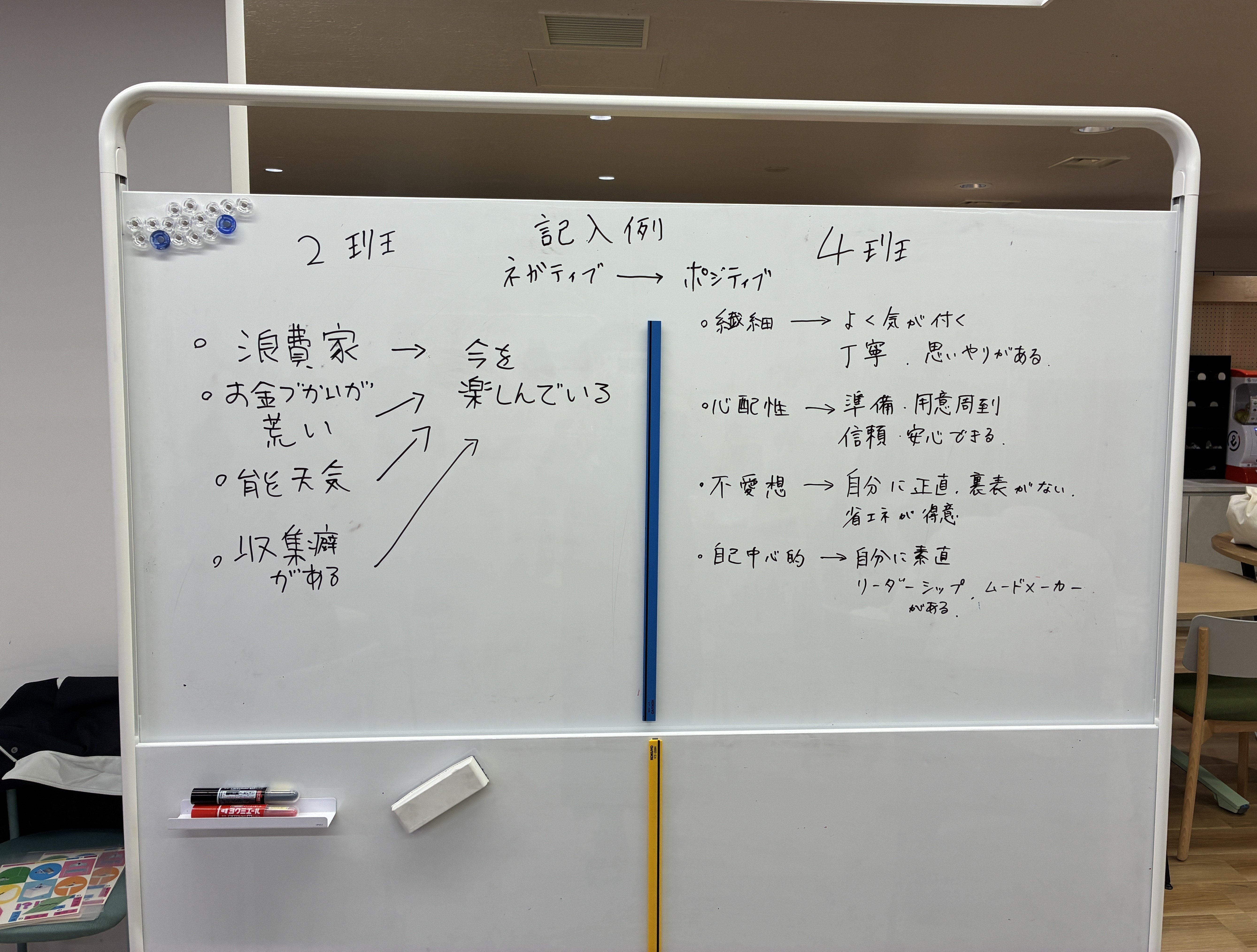 浪費家、収集癖という短所は、「今を楽しんでいる」にも言い換えられる等の発見がありました。
